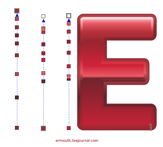 Разъединяем всё и заливаем объекты градиентами по схеме вот с этого рисунка.