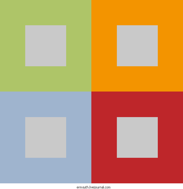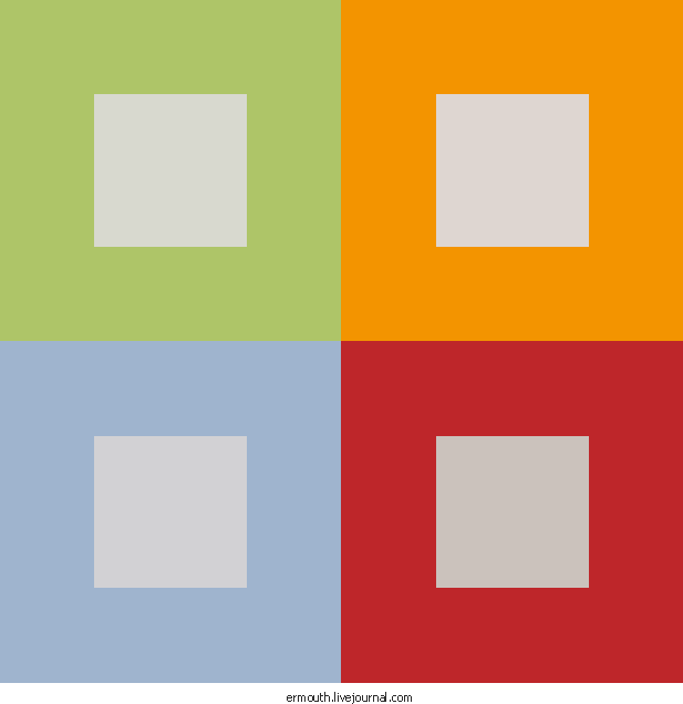 Специально для дизигнеров пост, про колористику, адаптацию и другую хню. Вот на картинке слева (тыкабельна) вы наблюдаете типичную демонстрацию того, что равные значения не всегда дают равные цветовые ощущения. Вот кажется, что серые квадратики на цветных квадаратиках -- примерно одинакового цвета.