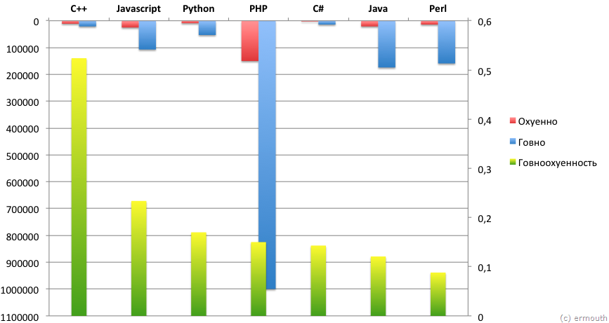 Народная оценка говноохуенности (кислотные столбики) языков программирования. Чем выше говноохуенность, тем круче.
