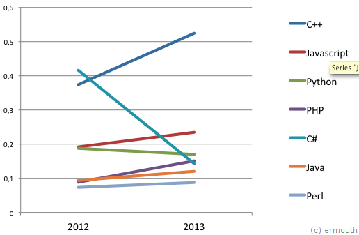 Интересно, что за год отношение к C# поменялось довольно сильно – и теперь он по мнению народа менее крут, чем простиосспади php. Имхо вполне заслуженно кста – проприетарные платформы это зло.